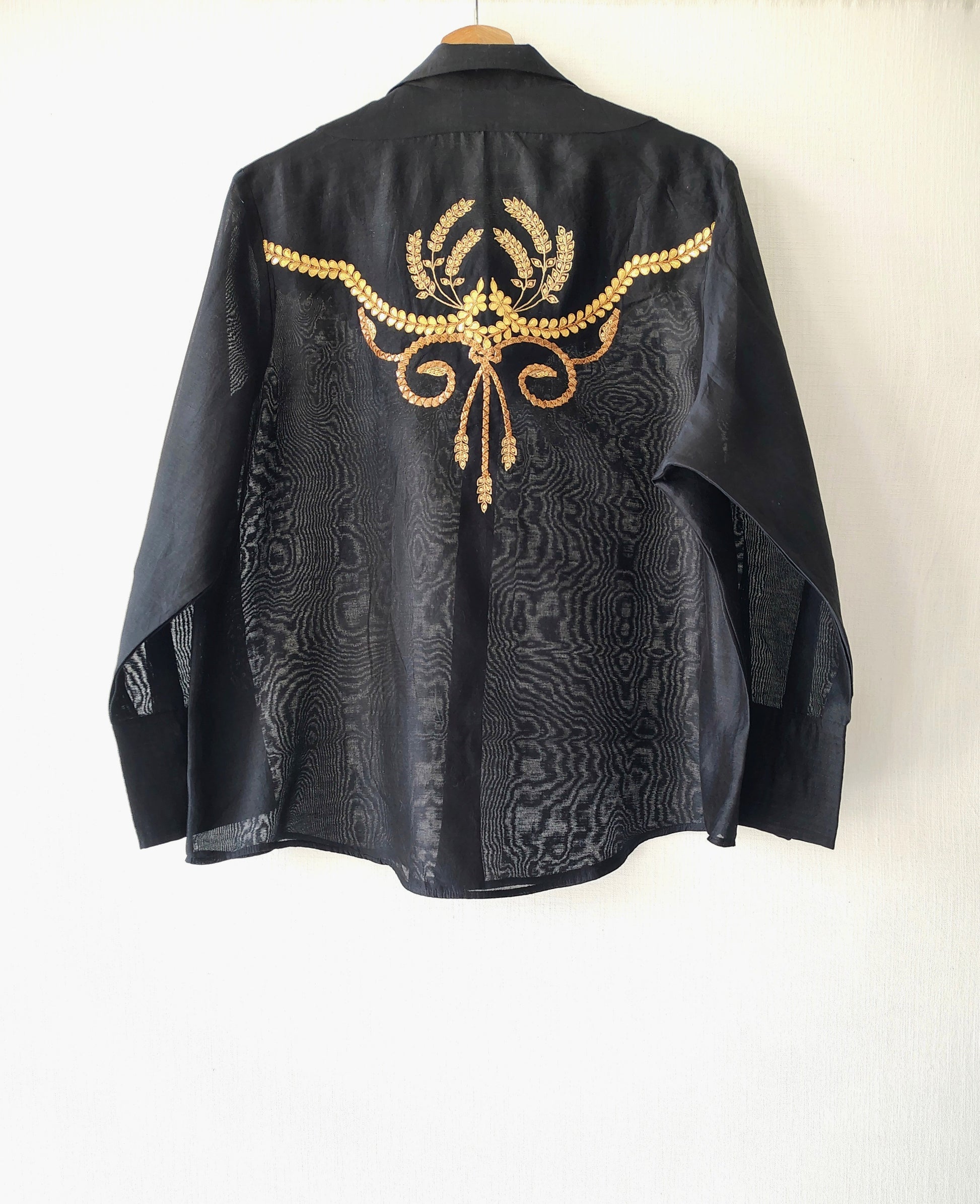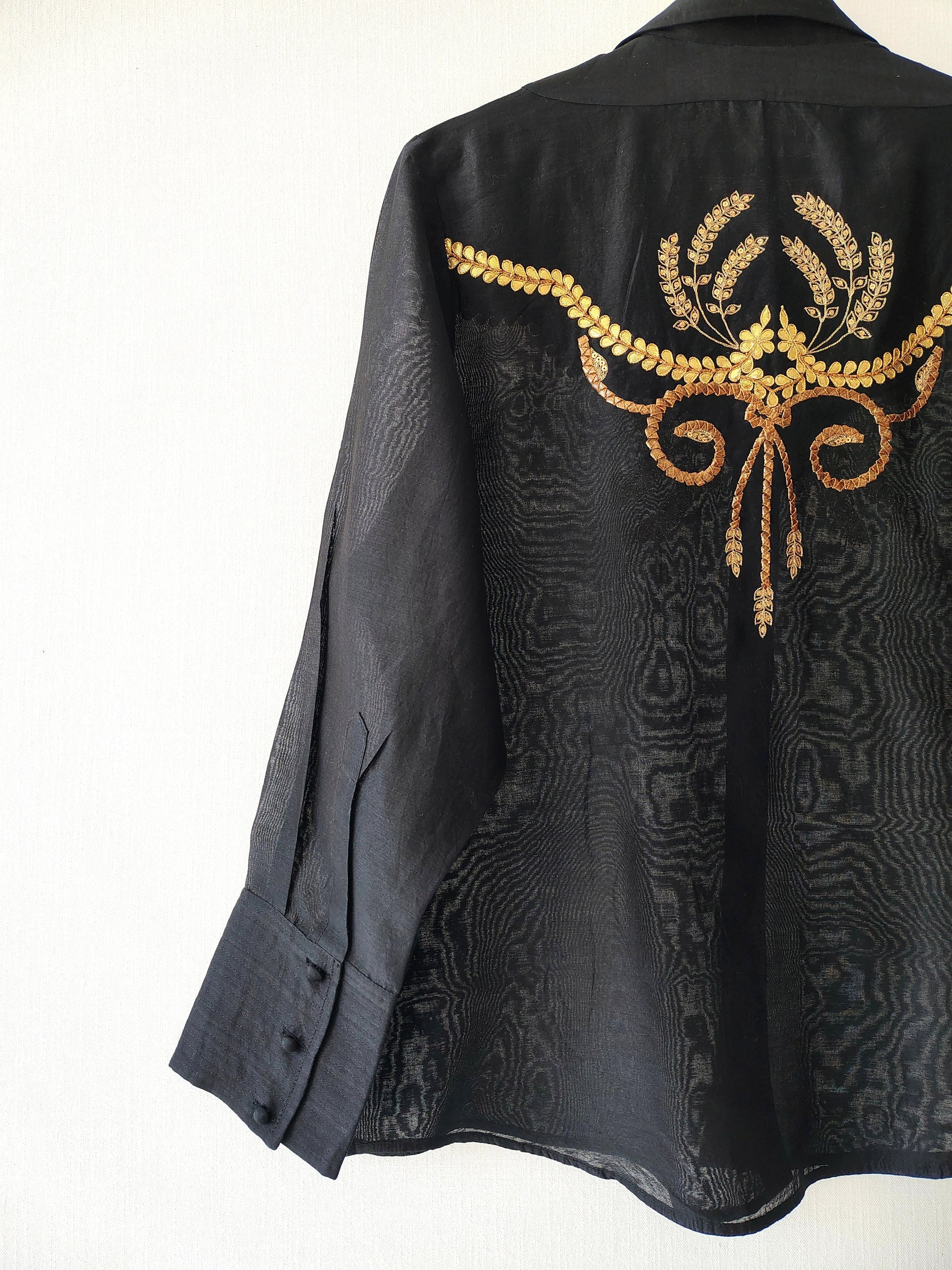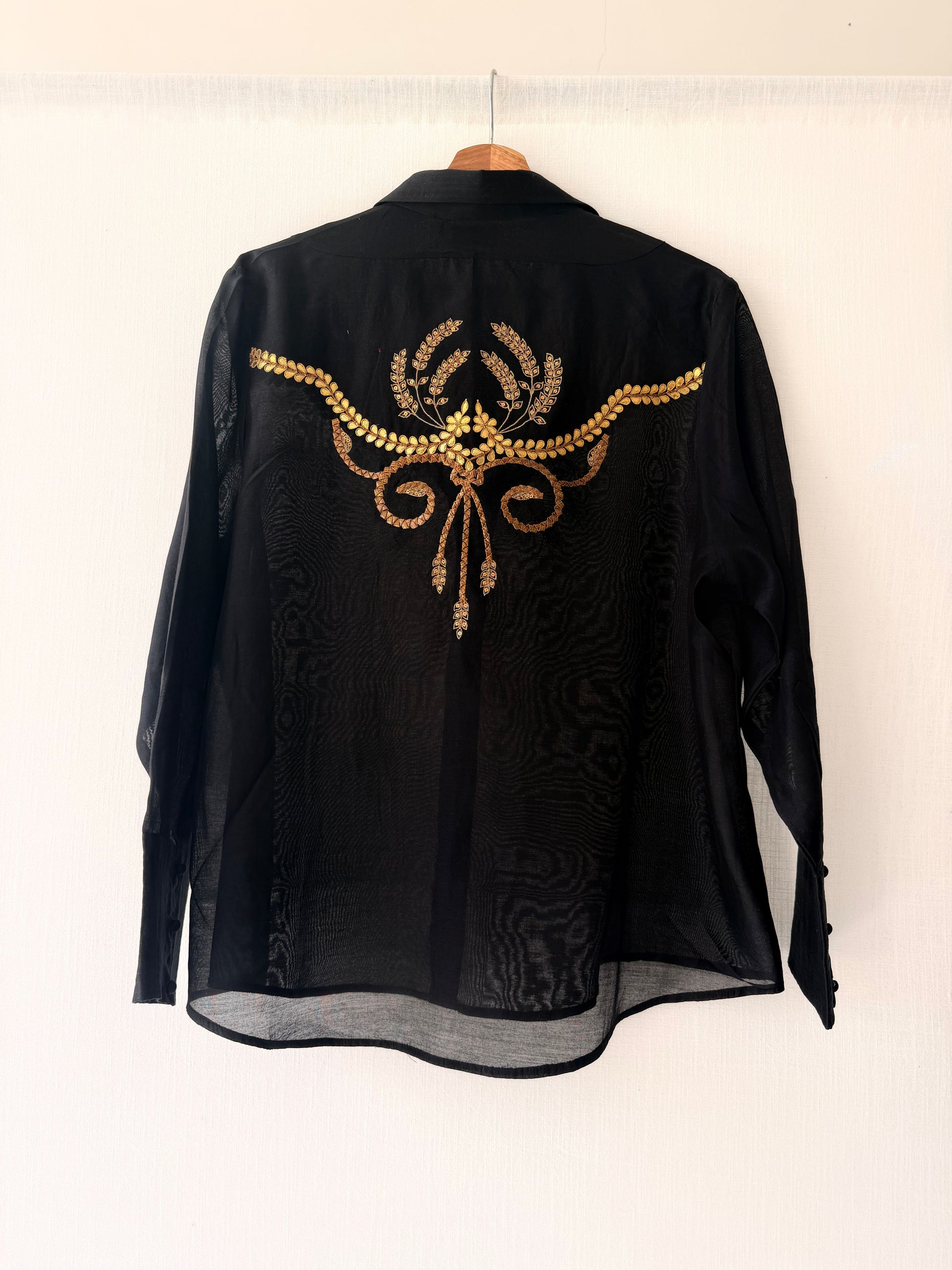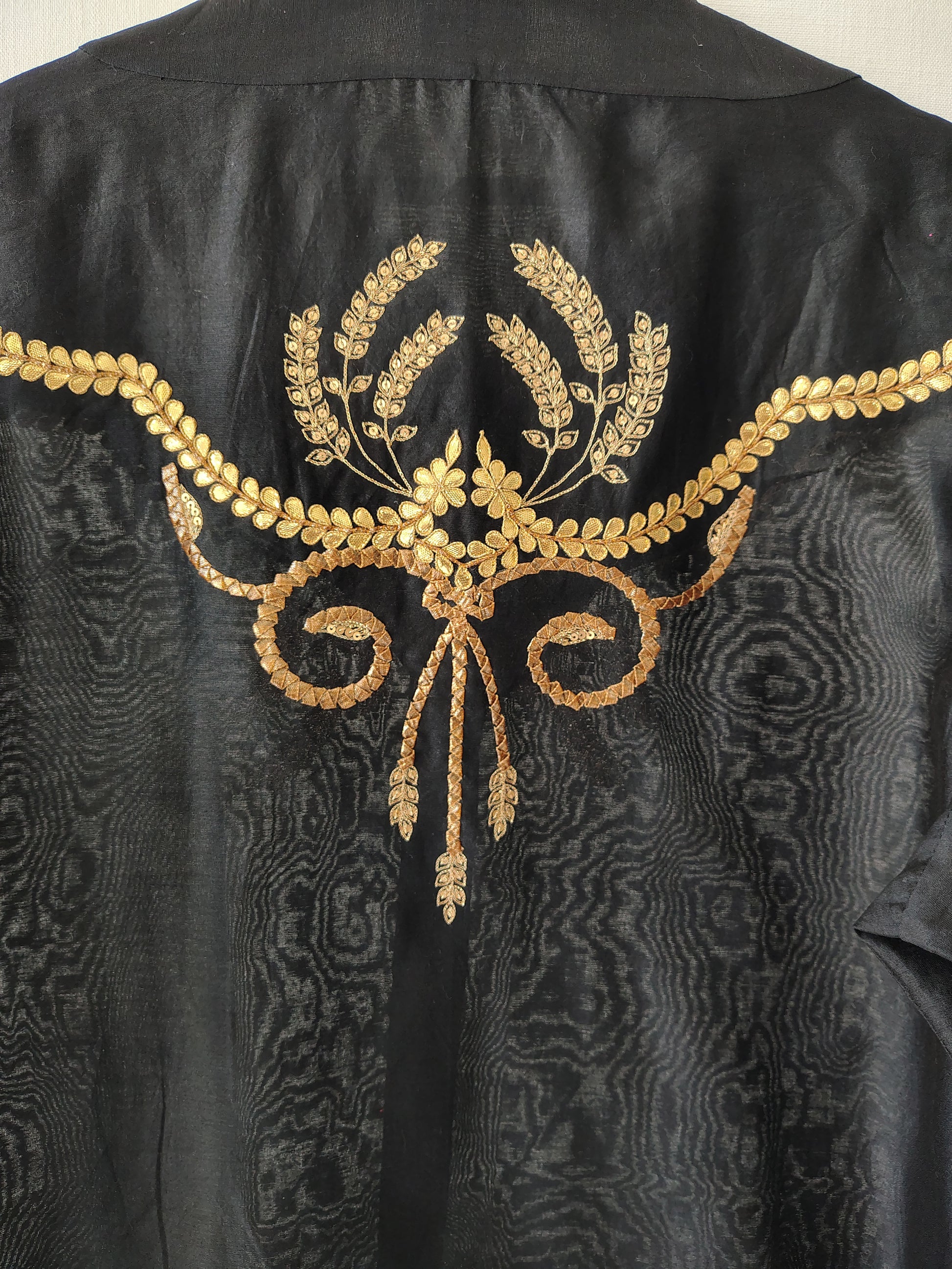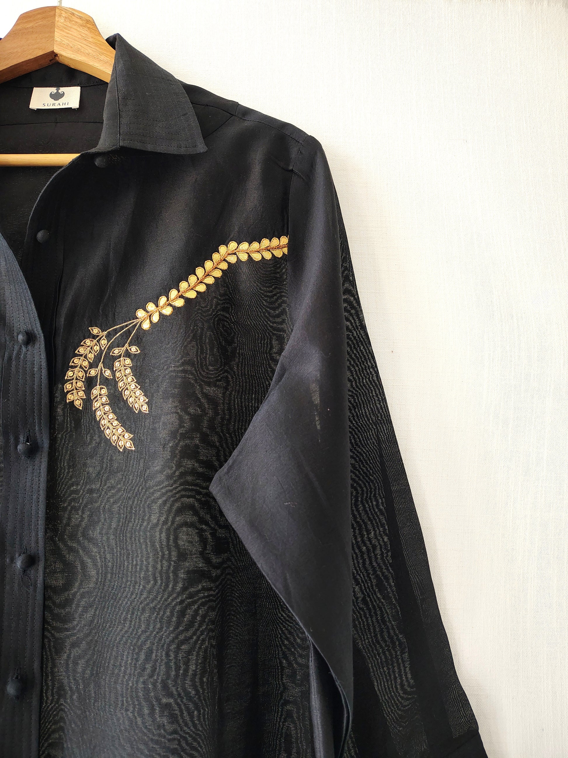 A statement Relaxed Fit shirt in cotton-silk chanderi. Featuring Golden Gota-Patti embroidery on the front & back, button down front with a quilted edge, cuff and collar.