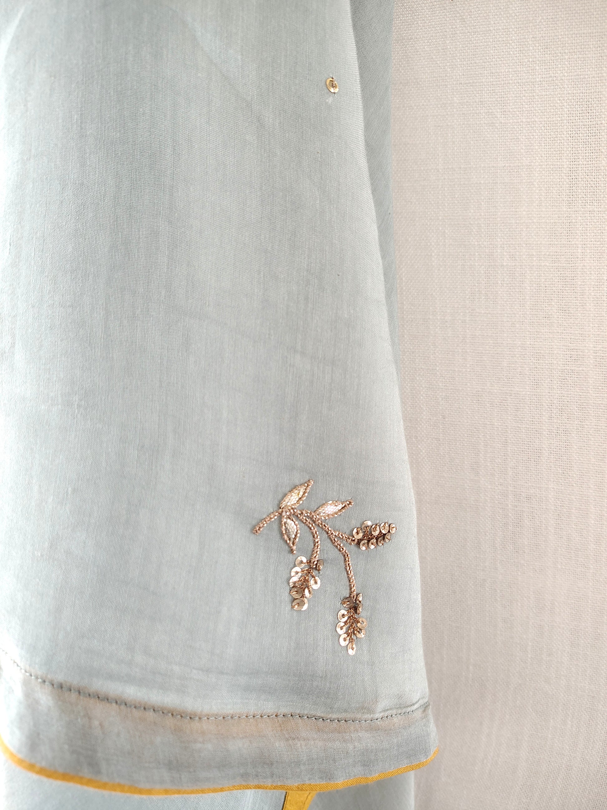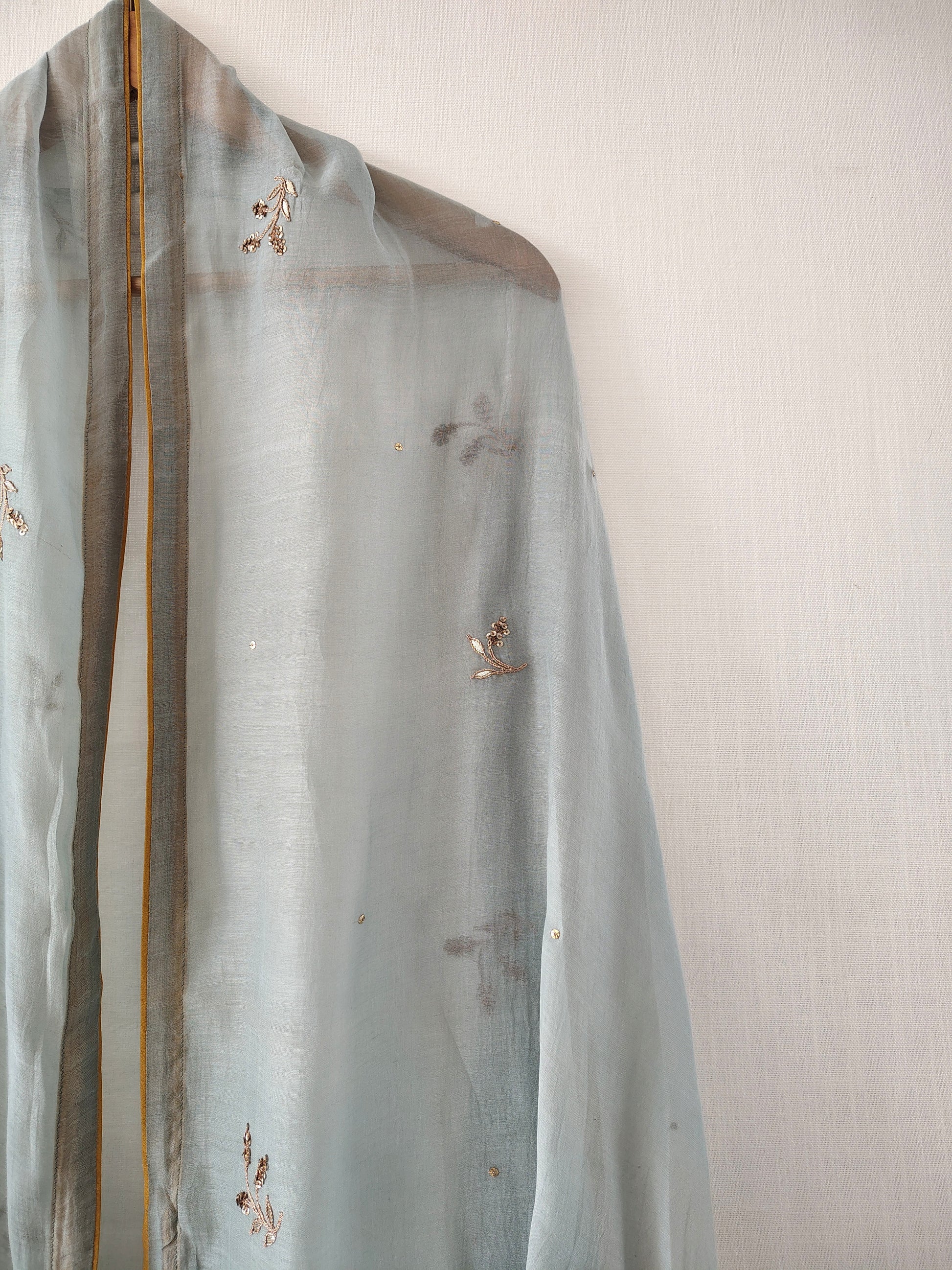 Cotton silk dupatta with delicate gold gota-patti embroidery. It has small gota flowers all over, the design features bold placement embroidery for a statement look.