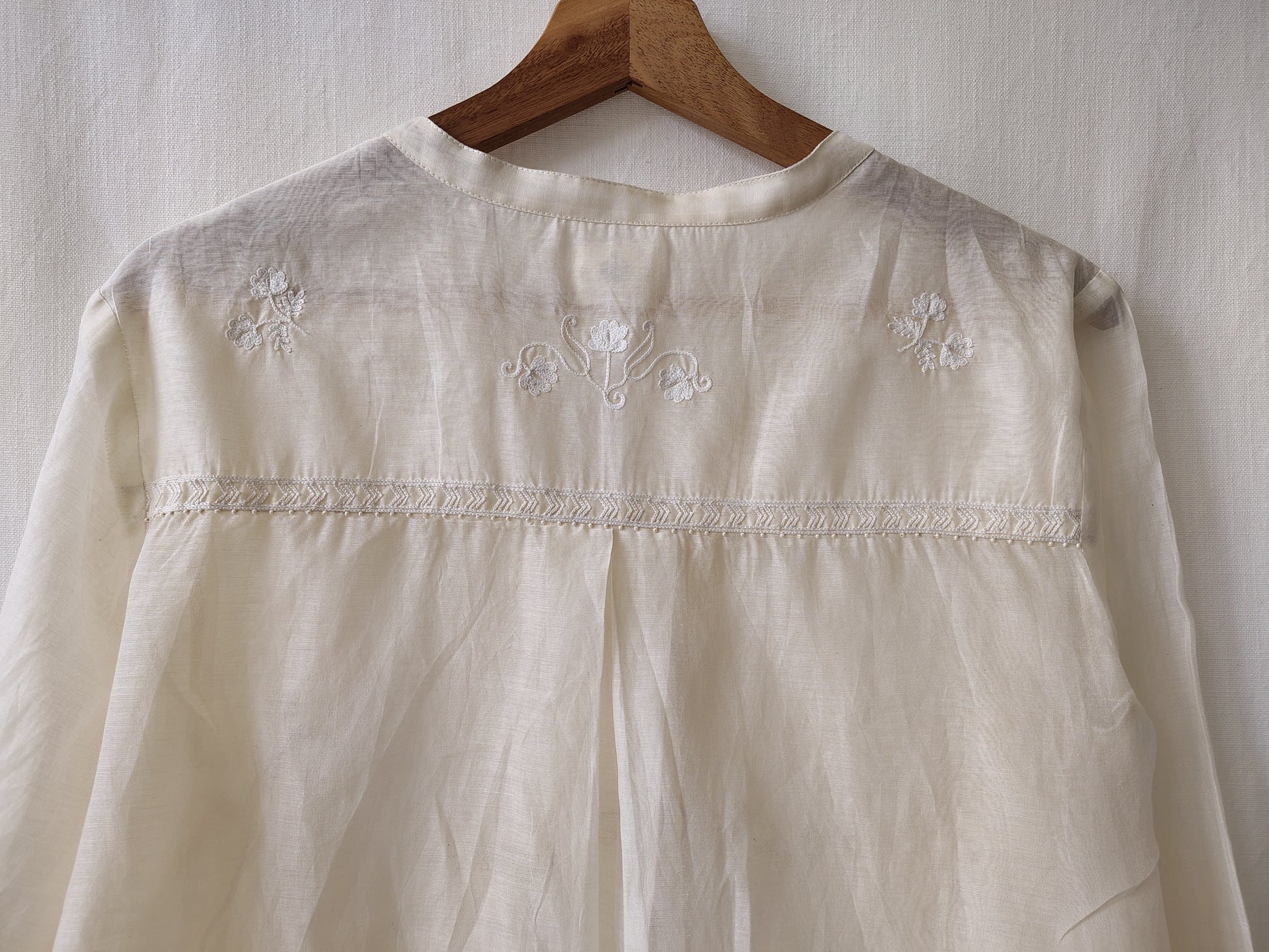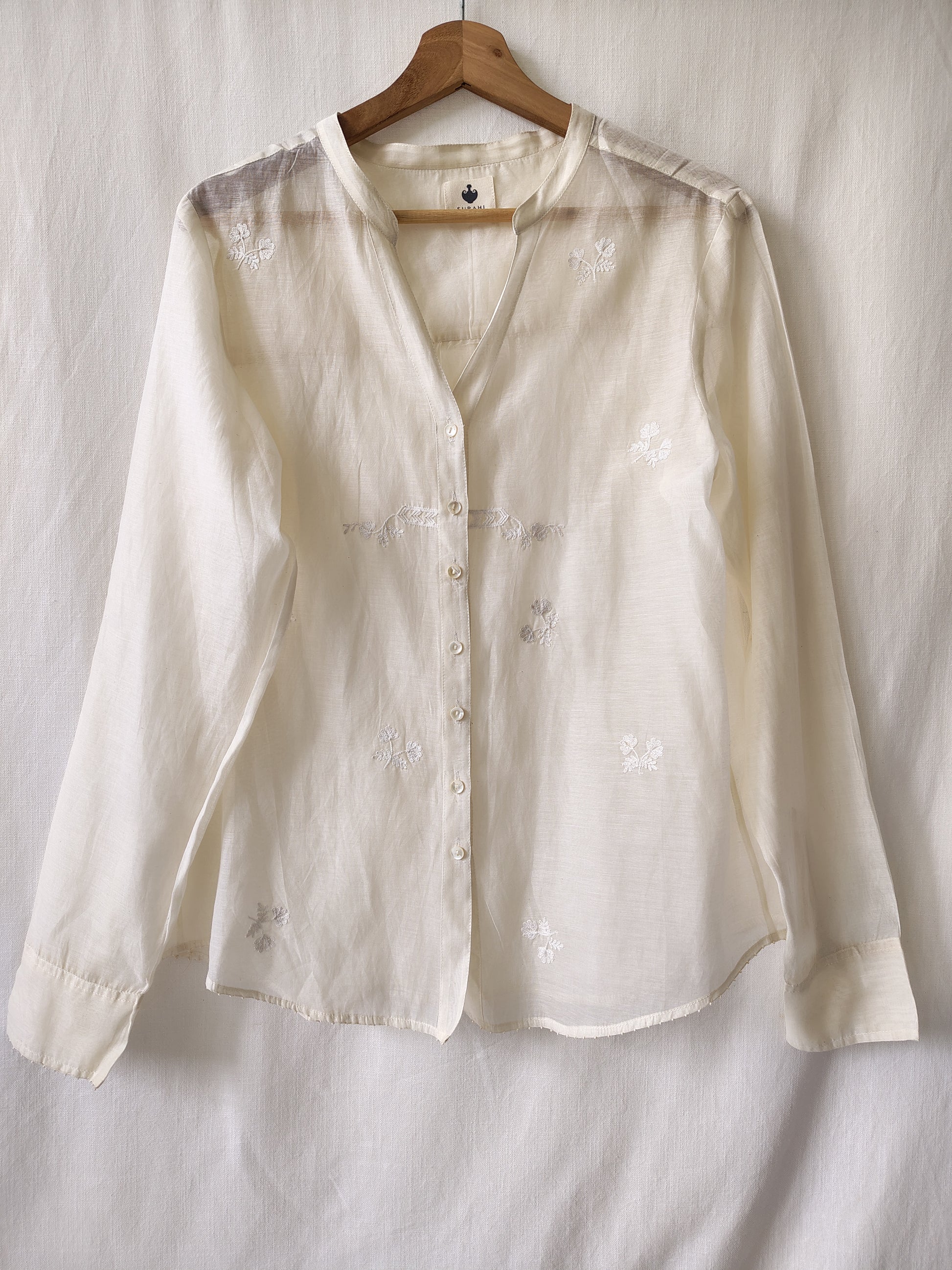 A Statement Sheer Hand Embroidered Shirt in cotton-silk chanderi. This statement shirt can be worn tucked in with black pleated wide leg trousers and a gold buckle belt for a polished, uptown look.