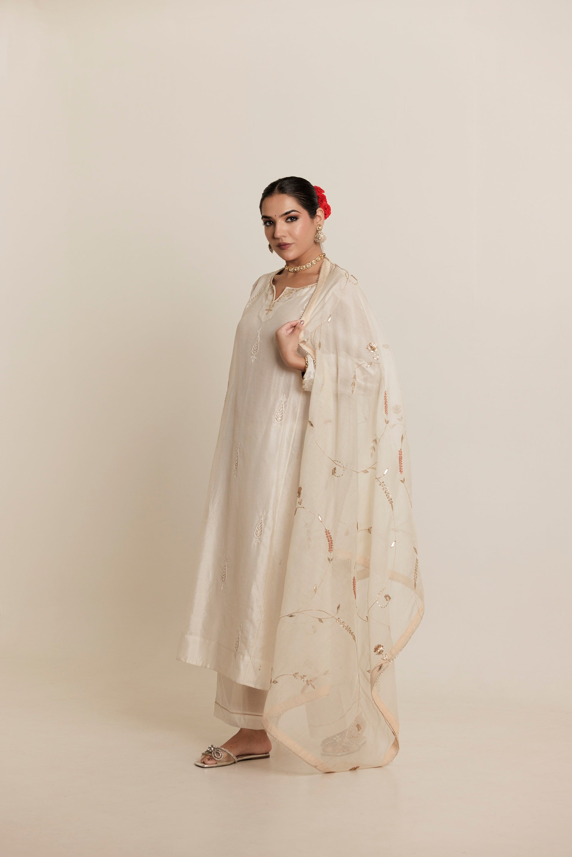 An Elegant Ivory Chanderi Kurta Set adorned with Zari detailing on the neck, sleeves and kurta making it an ideal statement piece for the upcoming festivities. The subtle shimmer of the embroidery highlights the richness of the design, perfect for making a statement at any occasion.
