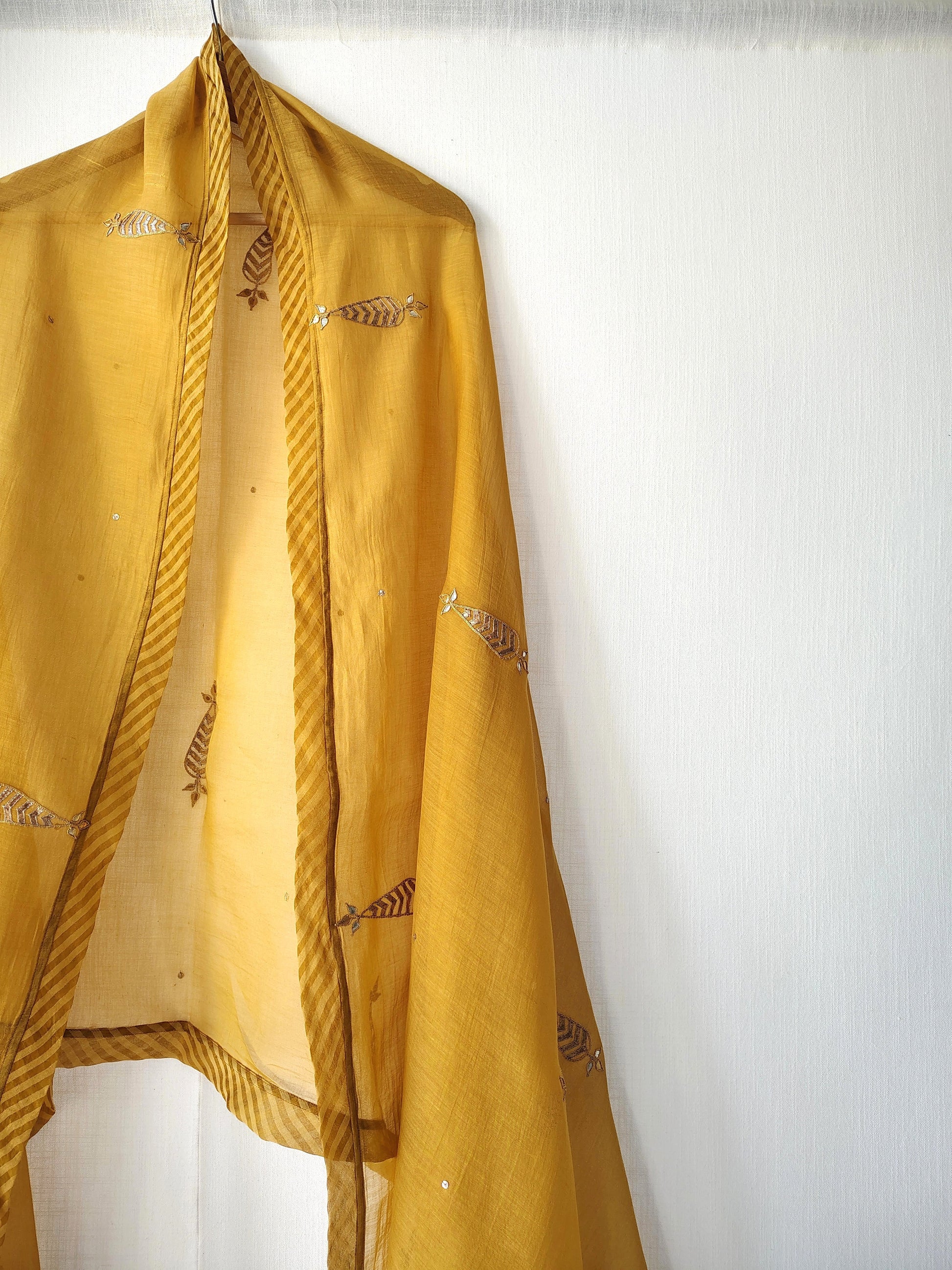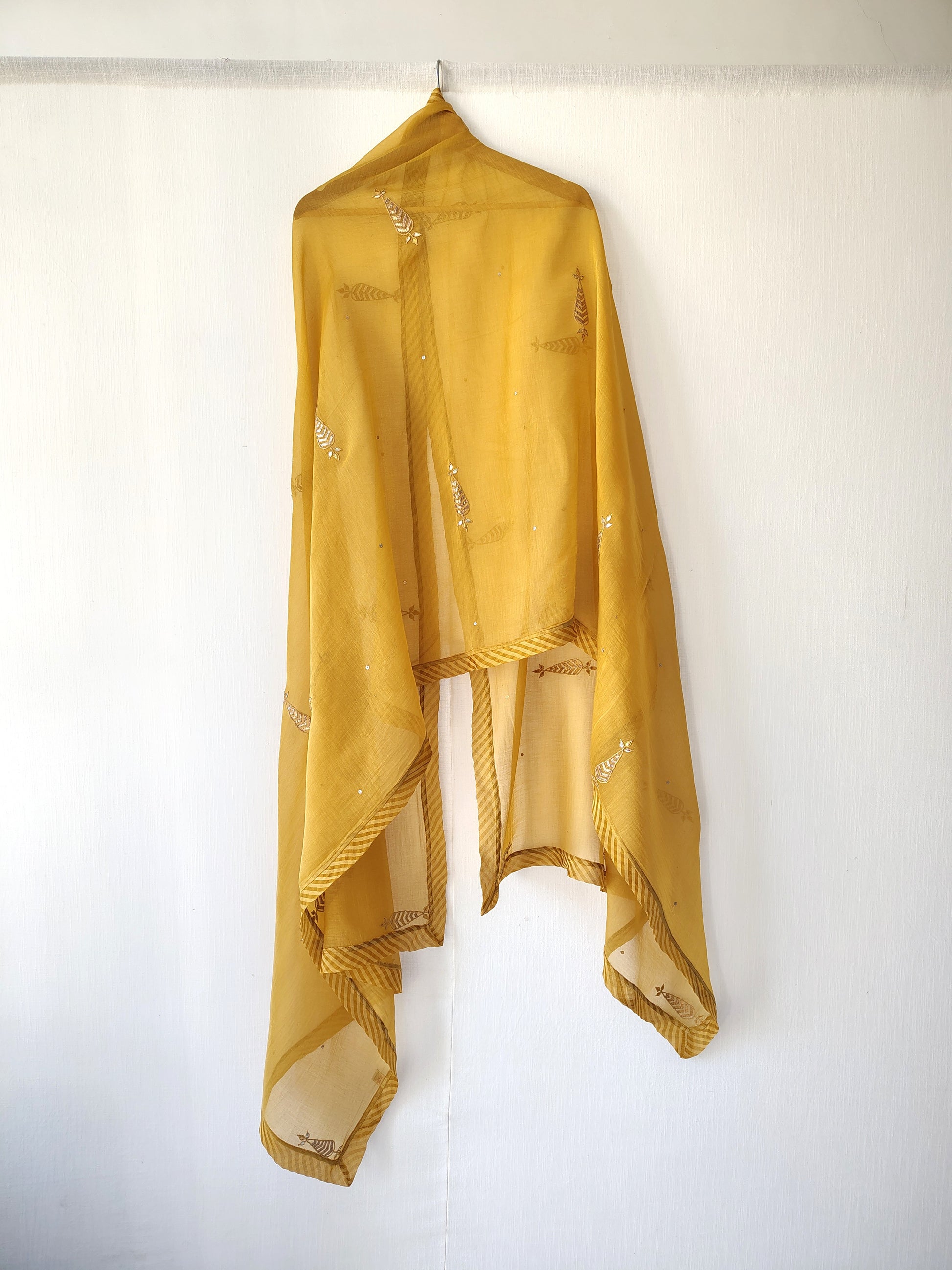 Hand Crafted Mustard Cotton Silk dupatta with delicate gold gota-patti,and zari embroidery finished with accent colour stripe facing. Wrap around this astounding piece and grace your favourite occasion. The beautiful and intricate gota-patti work showcases the precision and perfection with which the artisans have worked on this elegant beauty.