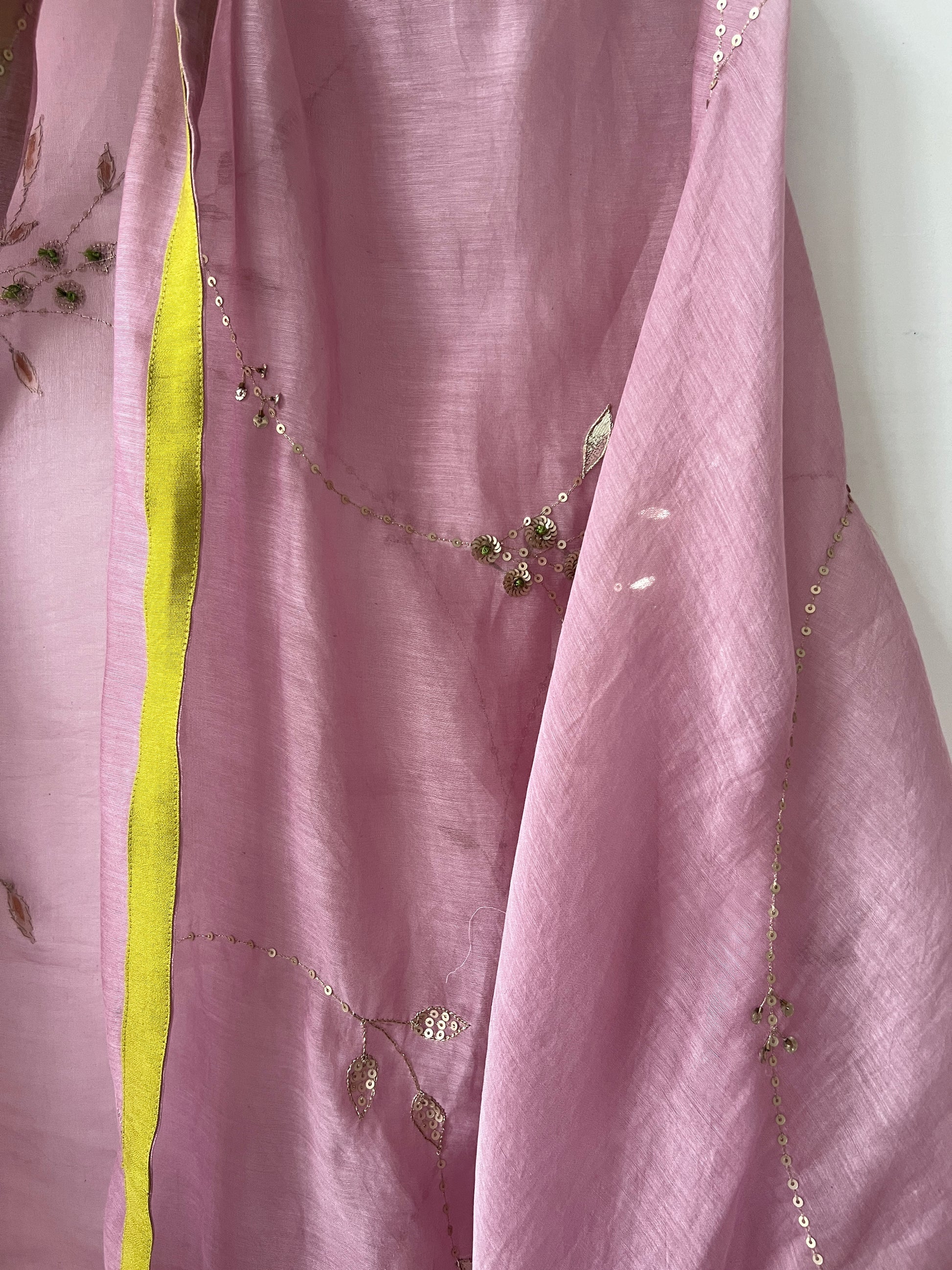 This Lavender Pink & Mustard cotton silk dupatta with delicate gold gota, zardozi sequins embroidery, It has small gota flowers all over. Wrap around this astounding piece and grace your favourite occasion. The beautiful and intricate gota work showcases the precision and perfection with which the artisans have worked on this elegant beauty.