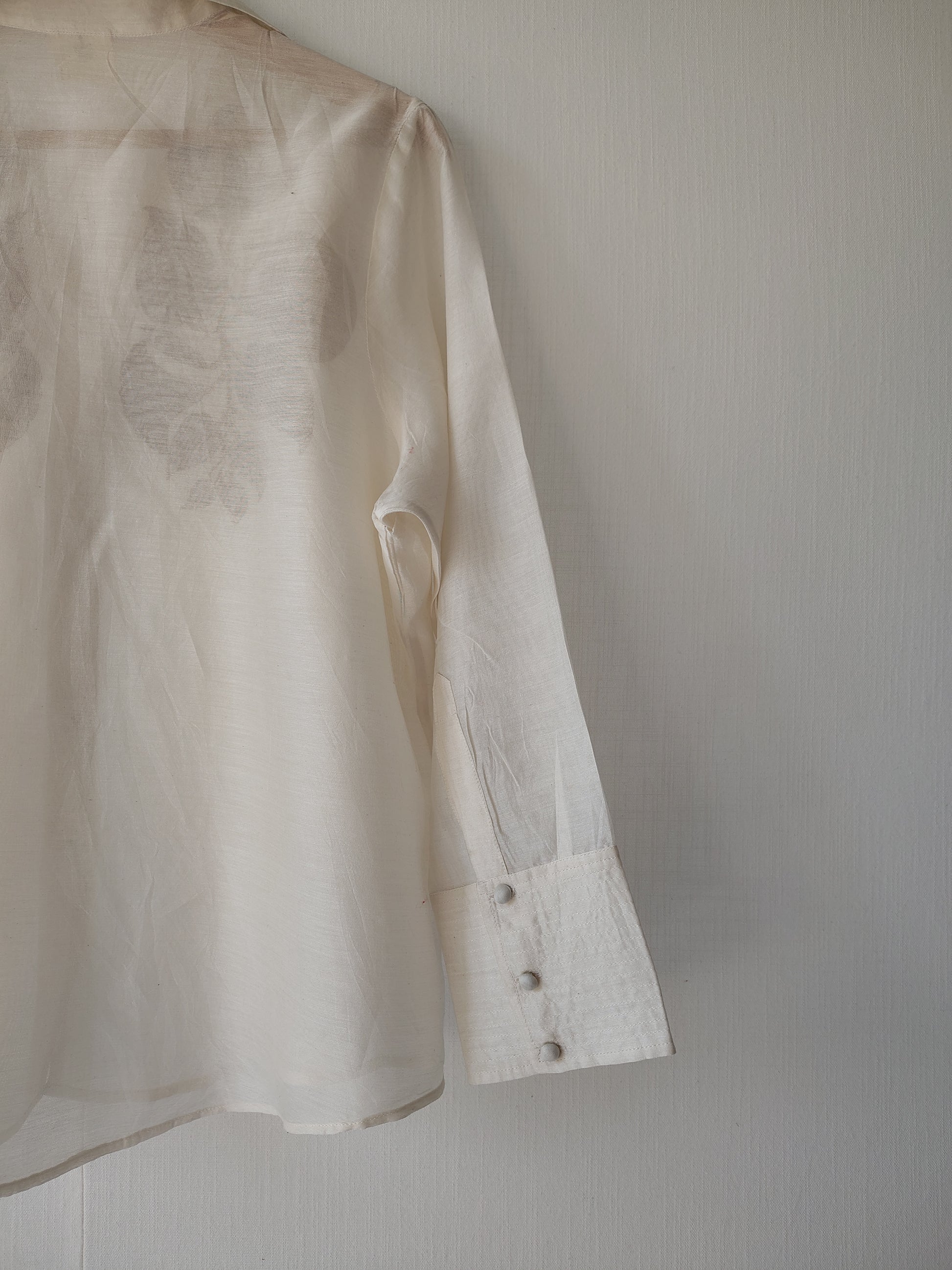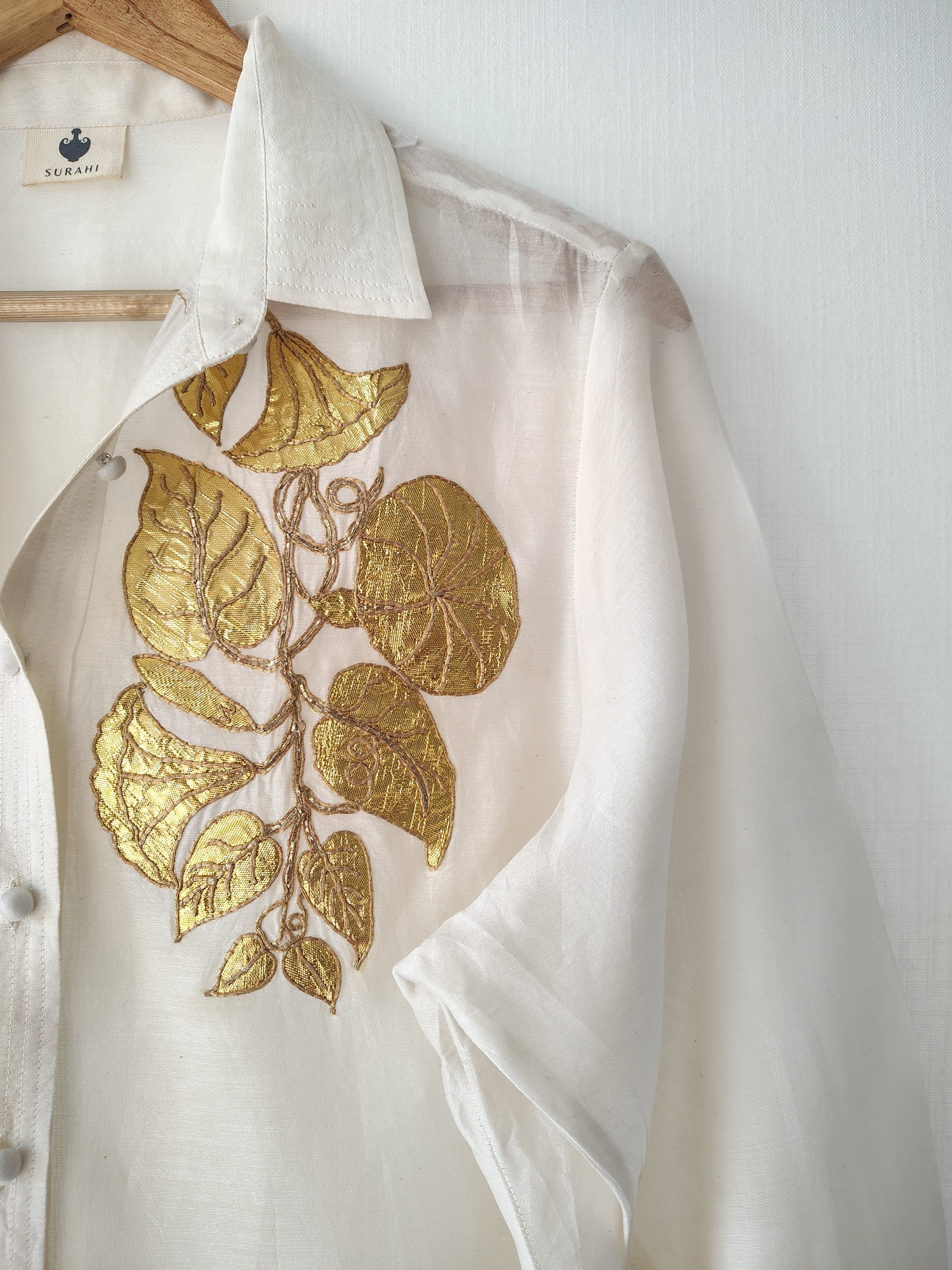 A statement Relaxed Fit shirt in cotton-silk chanderi. Featuring Golden Gota-Patti embroidery on the front, button down front with a quilted edge, cuff and collar.