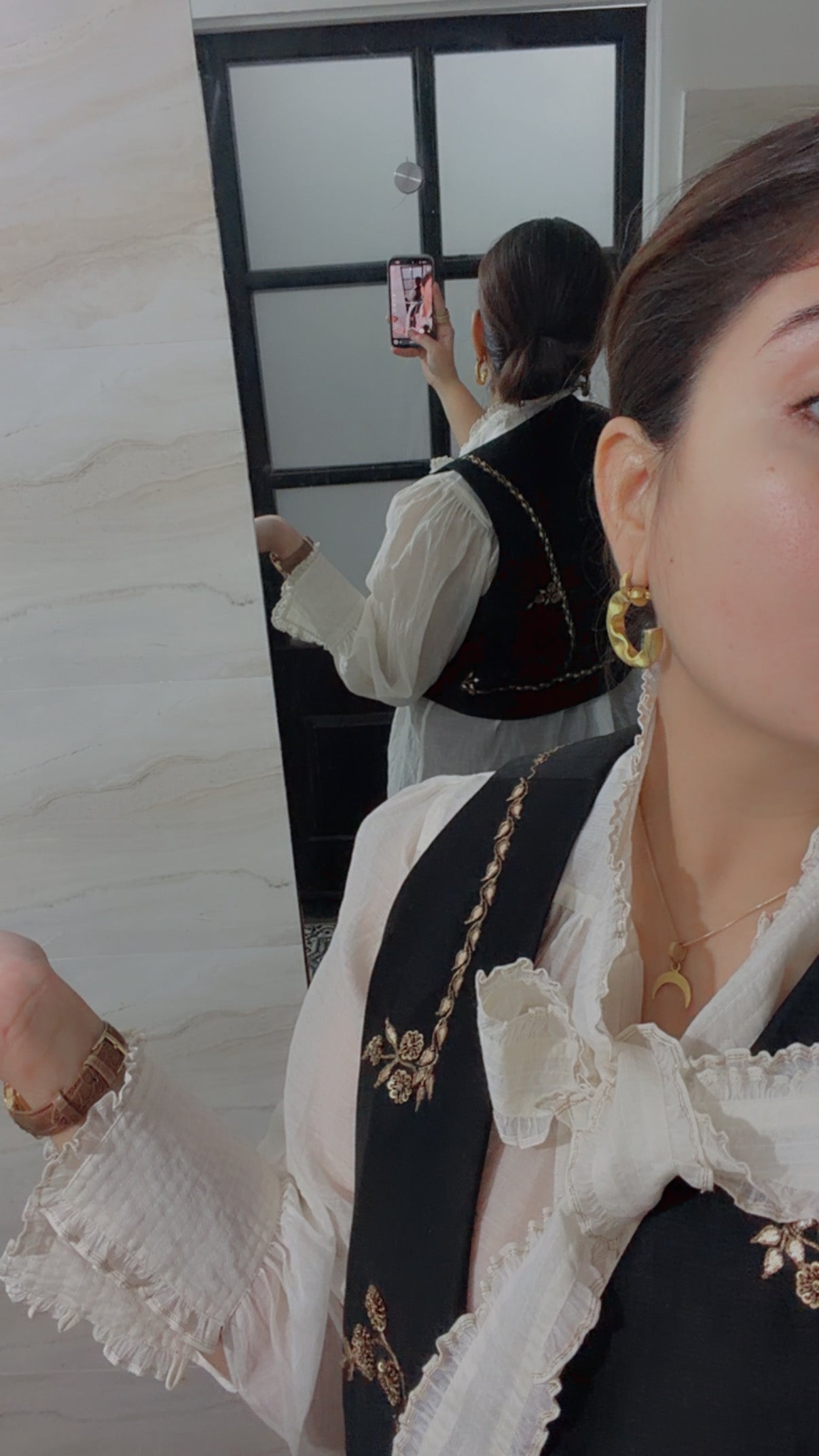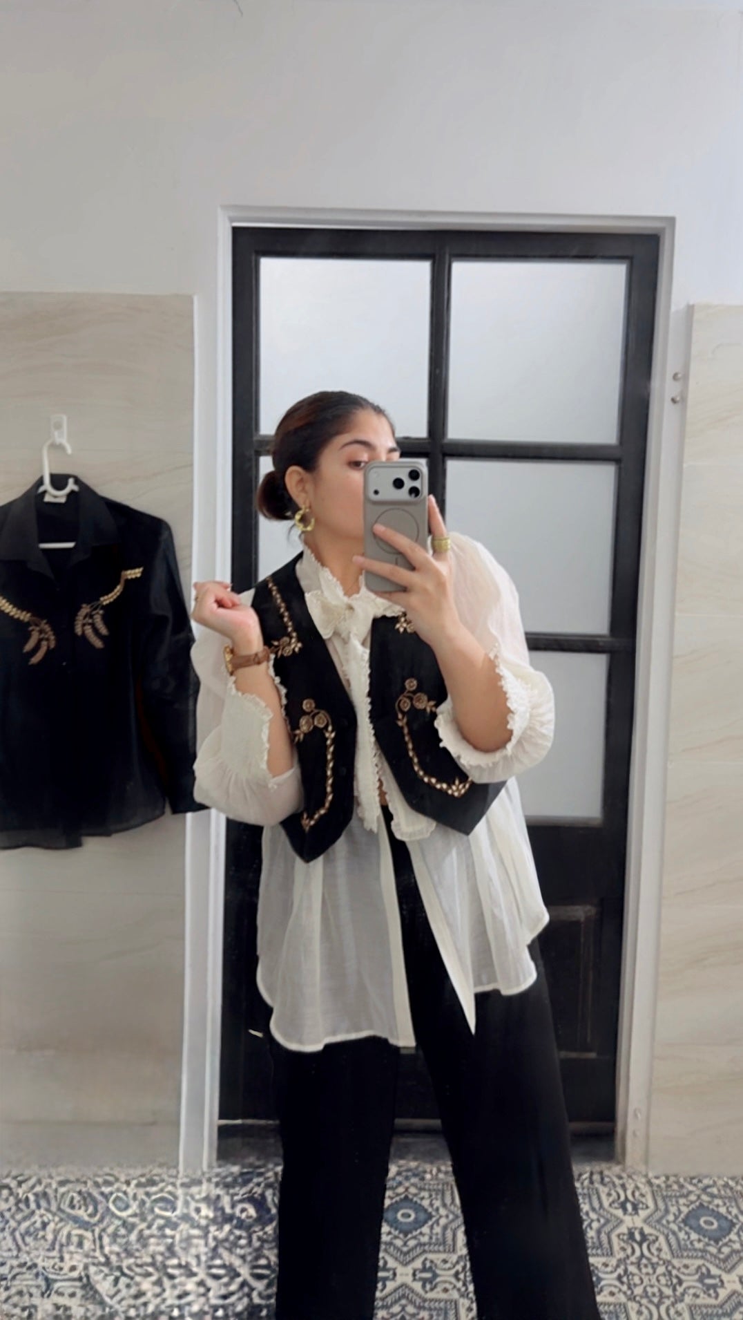 This gilet is a well structured, made in cotton silk. Embellished with copper gotapatti with a with zari appliqué over the patti and zari knot work, this unique embroidery placement gives the age old craft a modern refresh.